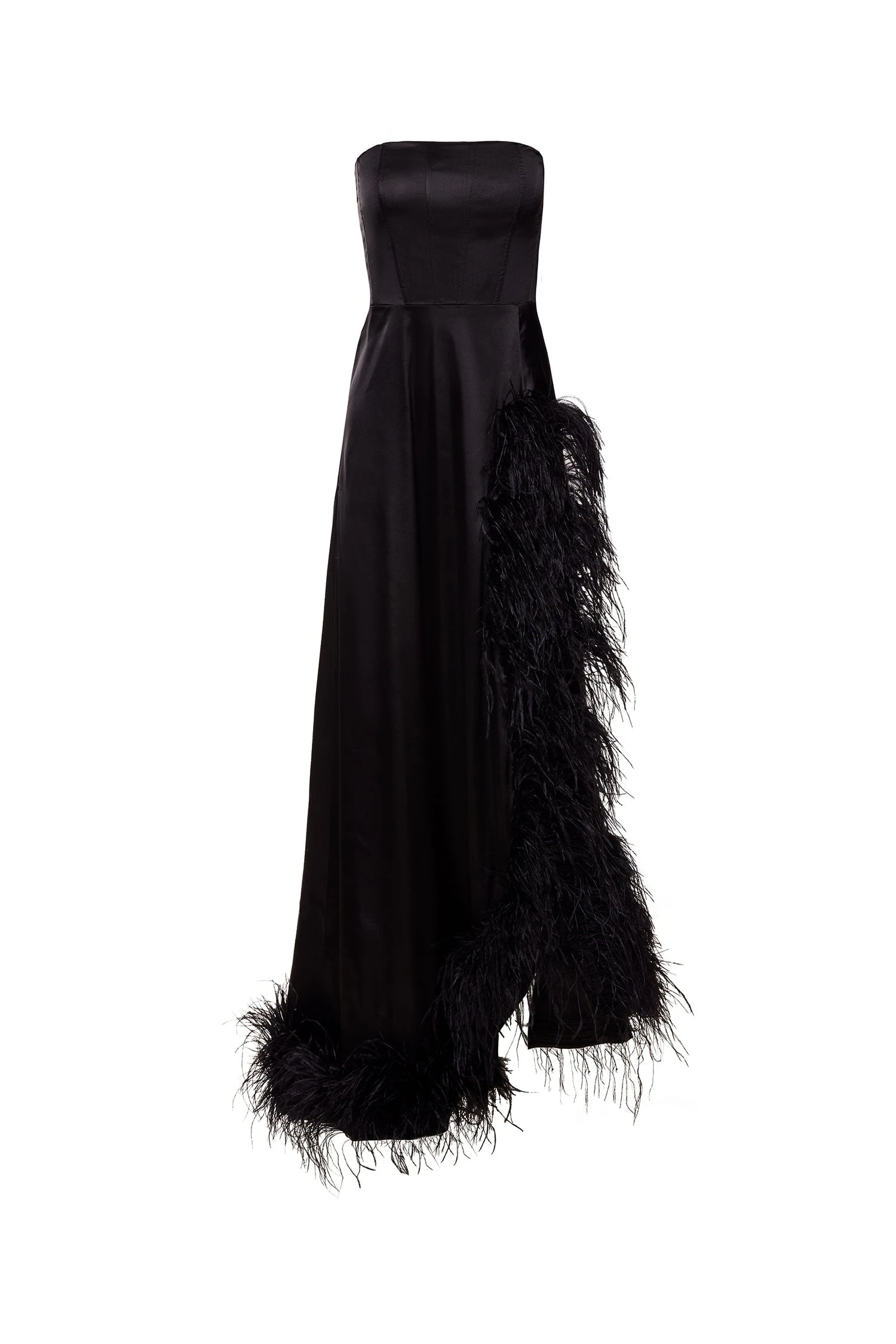 The Scarlett Gown emulates luxury with each detail. This style is formed with a strapless neckline and a statement feather trim. The classic black satin fabrication provides an essence of class to your evening edit.